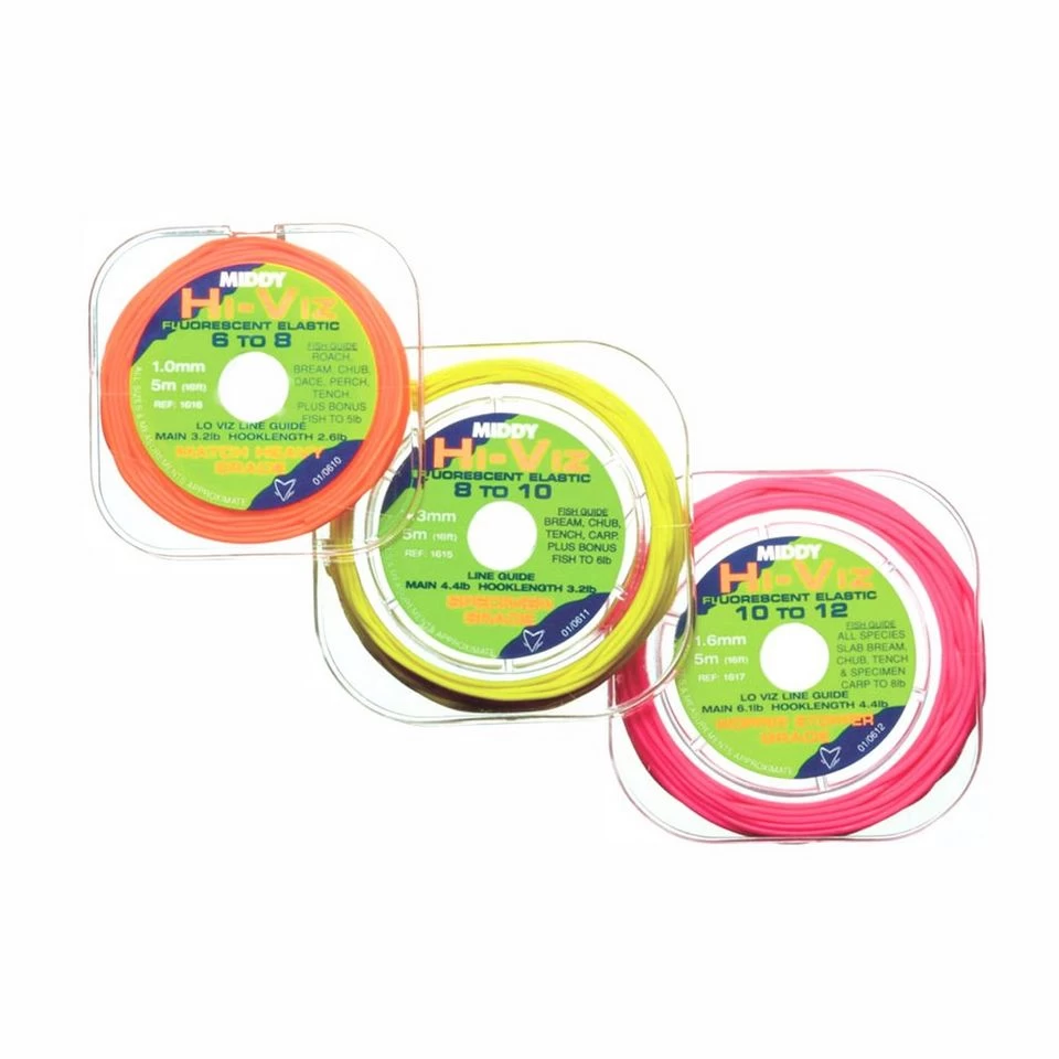 This Middy Hi-Viz Elastic is the number one seller in Europe and is ideal for commercial, monster carp! This 5 metre spool with 1 metre free is ideal for the keen angler. Because it has incredible stretch and is also fluorescent impregnated, it will keep season after season.